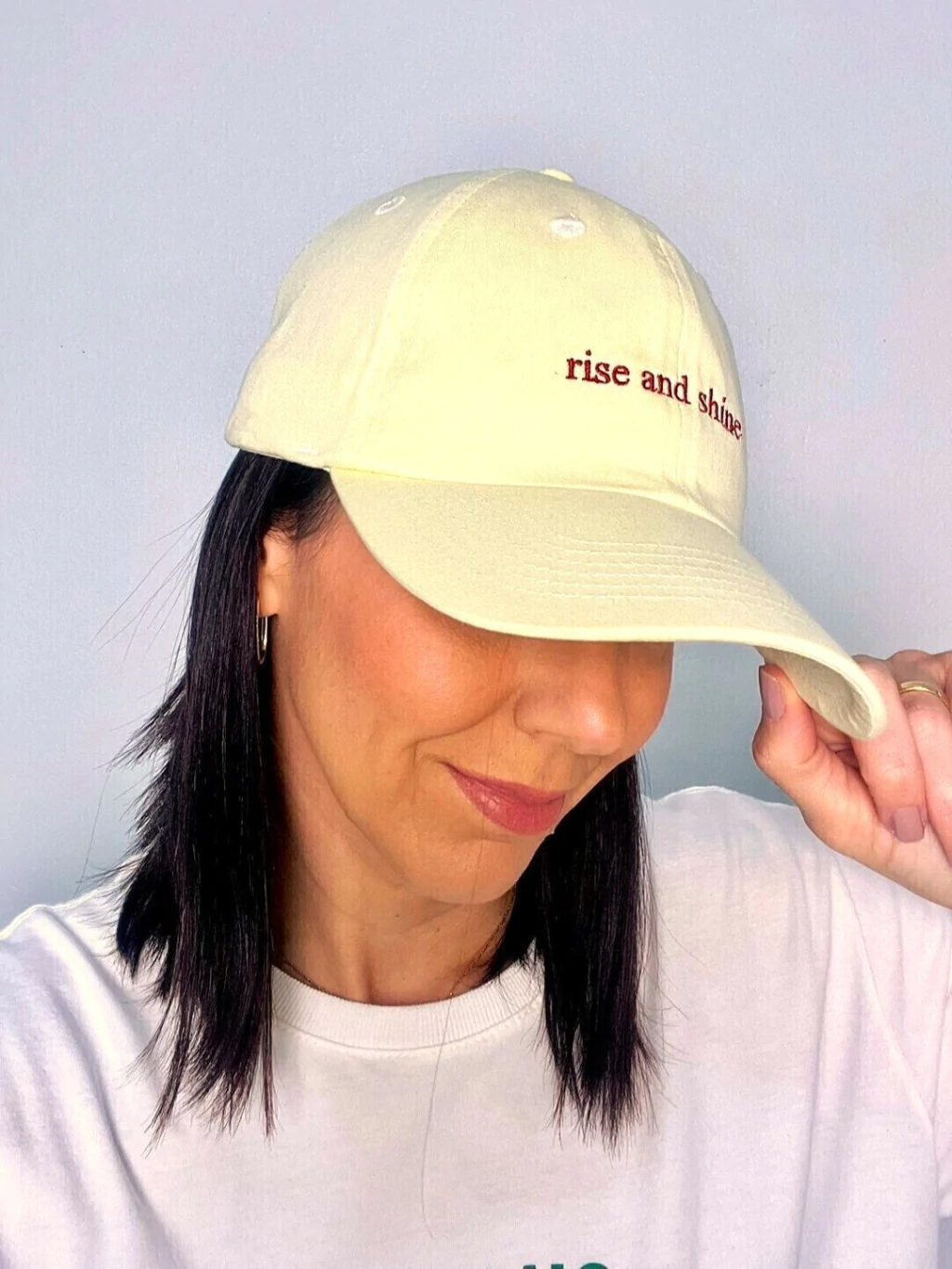 Boné aba curva dad hat, de sarja, 100% algodão. Cor amarelo claro com bordado de escrita rise and shine em vermelho cereja, logo Kizy na parte de trás. Regulador de algodão com fivela de metal.